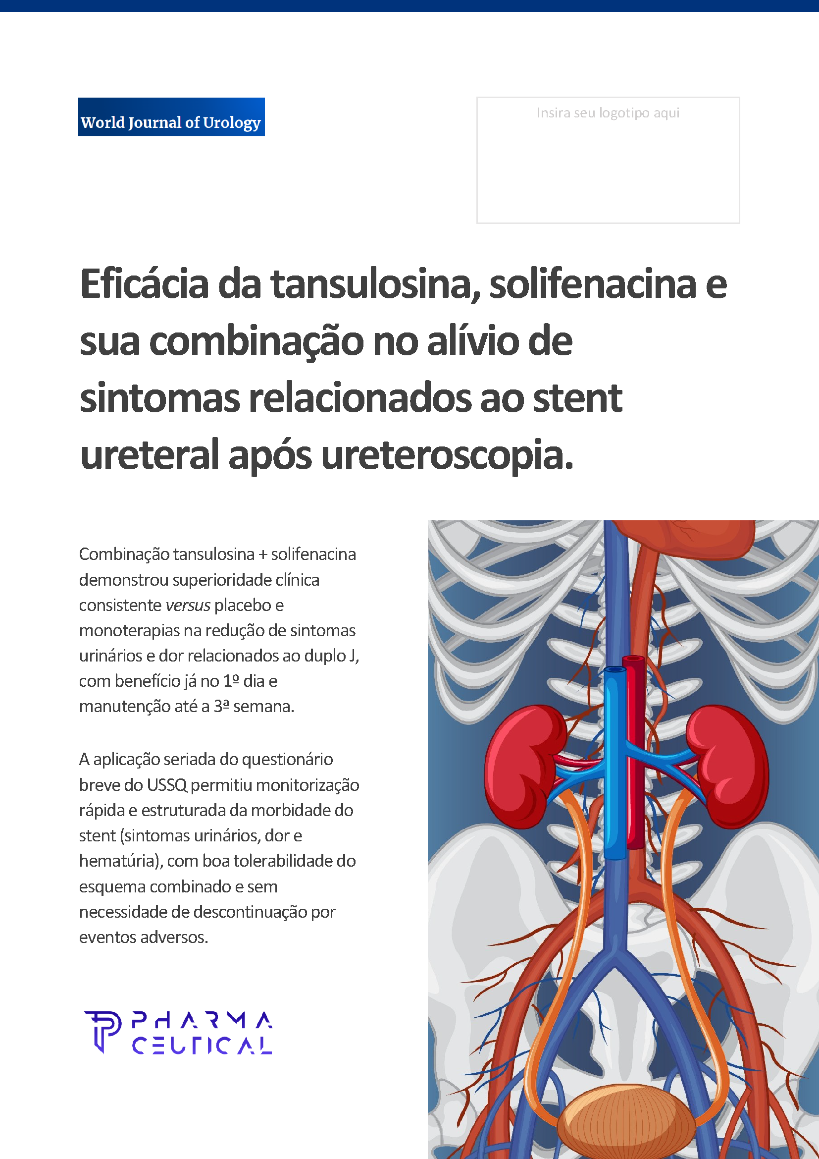 • Combinação tansulosina + solifenacina demonstrou superioridade clínica consistente versus placebo e monoterapias na redução de sintomas urinários e dor relacionados ao duplo J, com benefício já no 1º dia e manutenção até a 3ª semana.